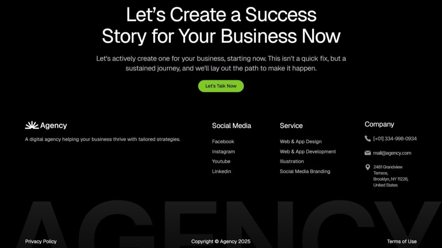 Agency is a complete digital agency website that highlights creative services through modern design, strategic content, and seamless user experience. Built with a focus on scalability, the site combines clarity, storytelling, and conversion-oriented functionality.
