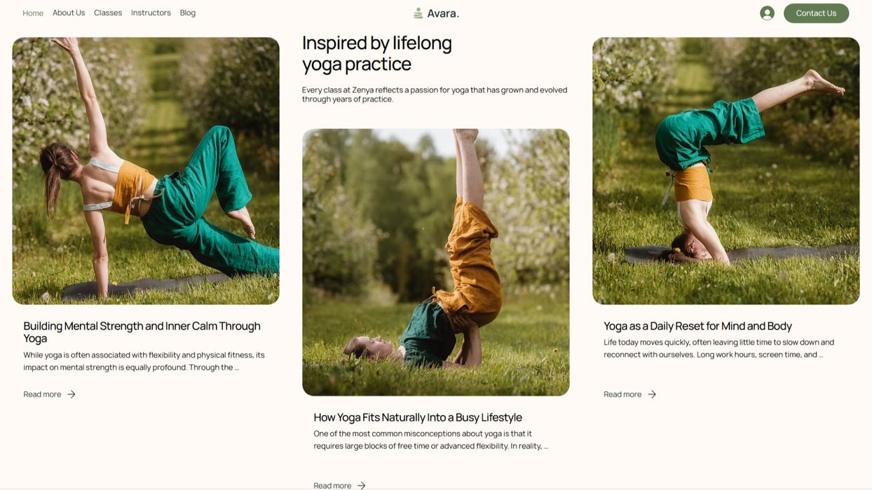 Avara is a complete yoga studio website solution crafted to support mindful living, physical well-being, and modern practice habits. The project was designed with a strong focus on simplicity, calmness, and usability, creating a digital space that feels as grounded and intentional as the studio itself.