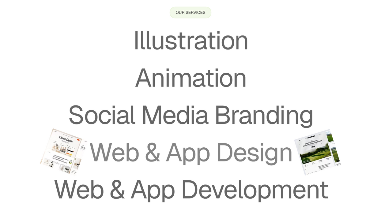 The Services page breaks down offerings like illustration, animation, branding, and web development into clearly defined sections, each supported by strong visuals, value points, and CTA buttons leading to relevant projects. The Work page showcases completed projects dynamically with category filters, helping visitors explore creative outcomes with ease.